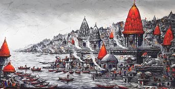Ethereal twilight Sandhya at the Kashi Ghats. Deep, luminous tones capture the mystical beauty of Ganga Aarti, where mortal meets divine. A moment of spiritual tranquillity & purification, connecting your space to an ancient, powerful source of divinity.