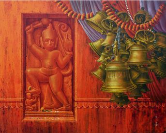 This vibrant painting features a carved wooden relief of Nataraja, the dancing form of Lord Shiva, symbolizing cosmic rhythm and balance. To the right, a cluster of temple bells and flower garlands evoke the spiritual ambiance of a sacred Hindu shrine.