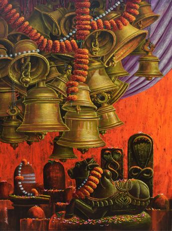 An evocative depiction of temple bells, sacred symbols, and the divine presence of Nandi and Shiva Lingam. A celebration of devotion, tradition, and timeless rituals in vibrant hues.