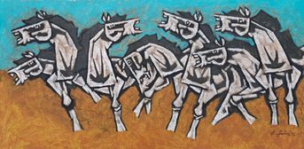 This original painting depicts seven white horses, defined by bold black outlines that accentuate their form and energy, evoking a powerful sense of motion and vitality.