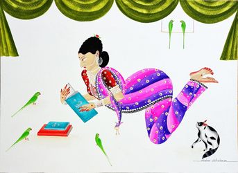 Bhaskar Chitrakar is a Kalighat 'patua' who has reinvented the traditional form to give us his quirky, detailed, contemporary Kalighats. This one looks at the Westernized Bibi who reads books and keeps pet birds and cats, like a British "memsahib"!