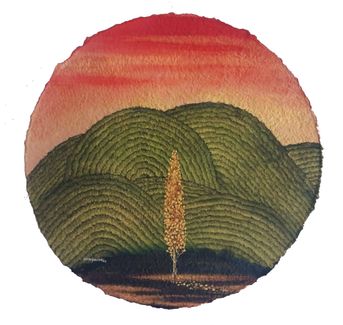 This artwork represents the imaginative landscape of human memory, where rolling green hills symbolize layered recollections.