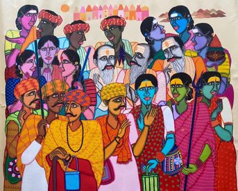 People from diverse walks of life journey together towards a sacred pilgrimage, carrying hopes and wishes in search of peace. Their collective path reflects a shared longing for spiritual connection and prayers for universal well-being.