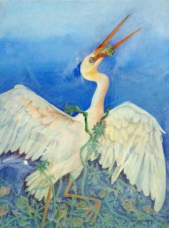 A striking artwork of a white bird with wings outstretched, entangled in aquatic vines, capturing a dramatic moment of survival amidst nature’s struggle.