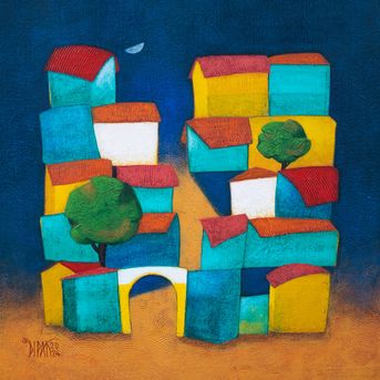 Created with acrylics on canvas, this artwork evokes depth, warmth, and a serene calm. Beneath the gentle glow of a moonlit sky, the village rests in a soft silver haze, capturing the quiet poetry of the night.