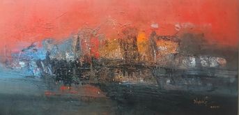A dramatic abstract painting with bold reds, deep blacks, and textured strokes, evoking a fiery skyline against shadowed forms and reflective tones.