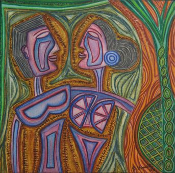 This colourful painting, titled Love, portrays an abstract couple in a warm and joyful embrace. Their distinctive forms and the way they gaze at each other evoke feelings of love, closeness, and unity. The smooth, flowing patterns in the background add a sense of movement and energy to the artwork.