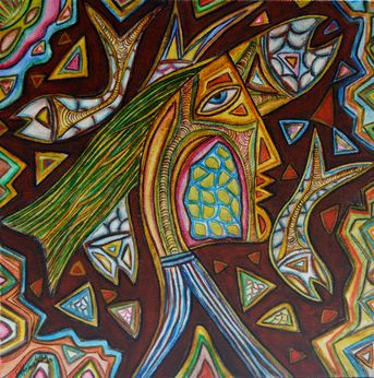 This vibrant contemporary painting depicts a woman with long green hair, surrounded by fish and triangular forms. Bold lines and vivid colours infuse the work with energy, while her large eye and intricate details add an air of mystery and strength. The artwork playfully blends fantasy and meaning in a creative, expressive style.