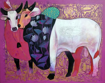 Two beautifully stylised cows stand close together, adorned with lotus motifs, ornate patterns, and vibrant fabrics. Surrounded by golden mythological carvings, they evoke a sense of serenity, divinity, and cultural richness.
