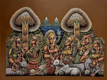 This vibrant and intricately detailed artwork presents a serene scene centred around women and cattle, evoking a rich cultural narrative grounded in tradition and community. The composition captures a moment of shared interaction among several women, who appear engaged in daily rural life or communal activity.