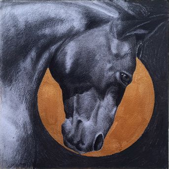 A realistic charcoal artwork highlighting the strength and grace of a horse’s face, accentuated by a golden backdrop that conveys richness and positivity.