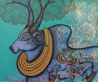 This painting captures the majestic presence of Nandi, symbolizing strength, peace, and divine guardianship. Detailed golden ornaments enhance its sacred aura, while soothing blue tones evoke calmness and spirituality.