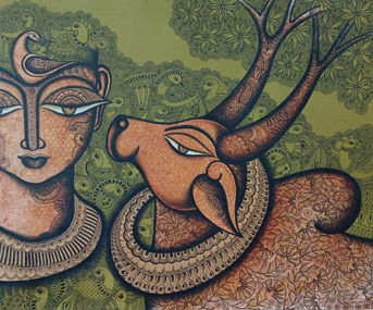 This painting captures a serene bond between human and animal, articulated through intricate folk-inspired patterns and earthy tones. Framed by birds and trees, it evokes harmony, balance, and a profound connection between life and nature.