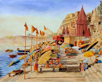 This realistic painting captures the timeless spiritual essence of Varanasi's colourful ghats, beautifully transporting the viewer to the holy Ganges riverside and its rich cultural heritage.