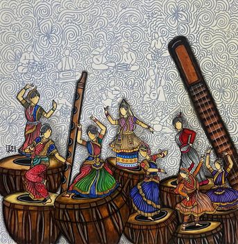 This artwork, titled Abhinay, celebrates the classical and traditional dances of India, where graceful figures in vibrant attire perform atop instruments, embodying rhythm, storytelling, and the timeless spirit of Indian culture.