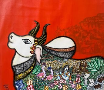A vibrant depiction of Krishna at Vrindavan, where intricate folk-inspired detailing and divine symbolism unfold across the serene form of the sacred cow.