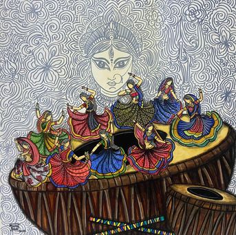 A vibrant artwork portraying nine women dancing in celebration of Navratri, symbolising the power, joy, and divine spirit of the nine sacred nights.