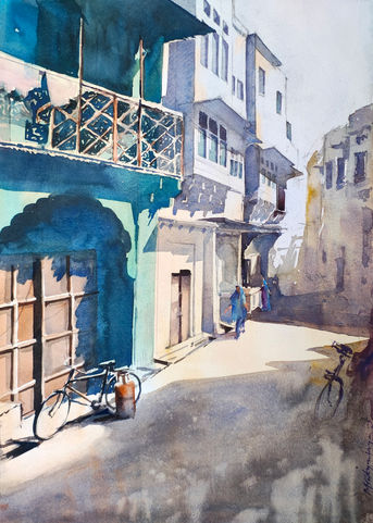 This watercolor painting beautifully portrays the old city of Jodhpur, capturing the enchanting interplay of light and shadow. The closely built, old-style structures exude a timeless charm, reflecting the city’s rich history and heritage.