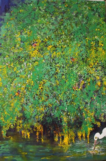 This landscape painting draws inspiration from the artist’s cherished childhood memory of a village pond, surrounded by lush trees with branches hanging low over the water, creating a serene and almost magical atmosphere.