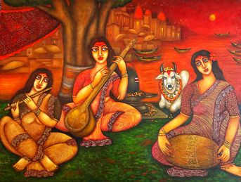 A cotemporary painting of Banaras Ghat, featuring three women playing musical instruments under a tree by the riverside, accompanied by a decorated sacred cow at sunset.