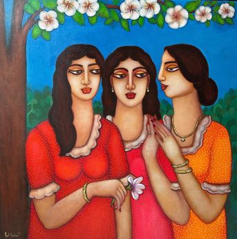 This vibrant painting portrays three graceful women under blooming flowers, capturing a moment of quiet intimacy, beauty, and timeless elegance.