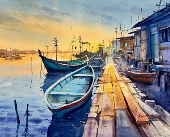 A serene harbour scene rendered in luminous watercolour, capturing moored boats gently resting against the glow of a golden sunrise. The composition blends tranquil light and delicate detail, evoking the quiet poetry of coastal life.