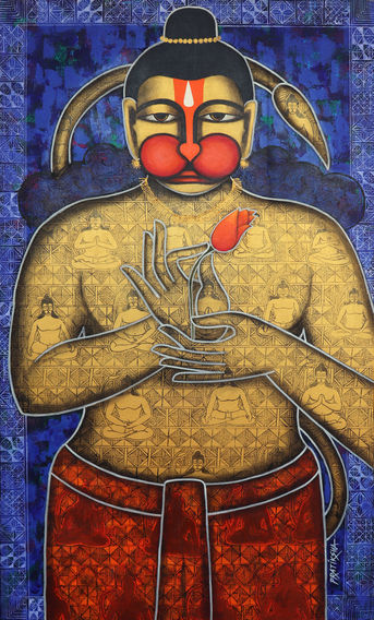 This acrylic on canvas depicts Kapeeshwar, the Lord of Monkeys, rendered in a richly symbolic composition that merges devotion, discipline, and inner awakening. Intricate patterns, meditative figures, and sacred iconography convey strength tempered by humility and spiritual restraint.