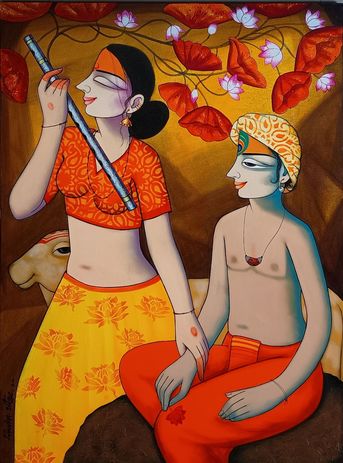 A vibrant digital artwork depicting Radha and Krishna in a serene moment, surrounded by lush flowers and warm, ambient hues. Their expressive forms and gentle gestures evoke harmony, devotion, and the quiet joy of nature.