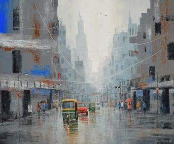 This evocative cityscape captures the essence of Kolkata’s urban life, portraying everyday movement, rain-soaked streets, and the resilience of its people amidst the rhythm and bustle of metropolitan living.
