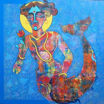 This contemporary, vibrantly colourful depiction portrays Matsya, the fish avatar of Lord Vishnu, holding a lotus, with the figure's tail intricately filled with scenes of Hindu lore against a stylised blue backdrop.