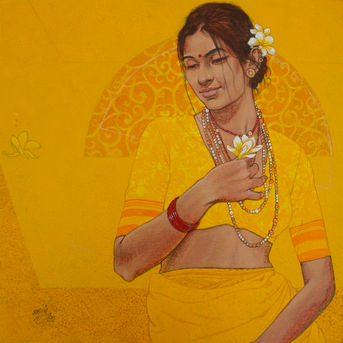 The Chafa, deeply rooted in Indian devotion and aesthetics, emerges here as a symbol of wordless beauty. It is simultaneously an offering and a whisper from the past. Through a controlled, minimalistic palette and elegant composition, the artist turns this simple flower into a timeless expression of grace and reverence.