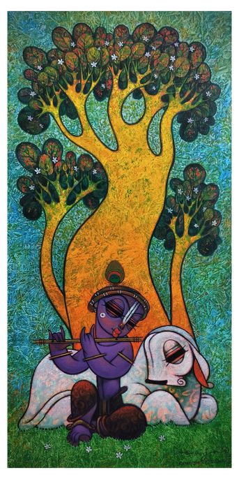 A vibrant artwork portraying the young Krishna playing his flute beneath a flourishing tree, resting alongside a gentle calf in serene harmony.