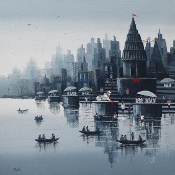 A tranquil, evocative depiction of the Banaras ghats, where temples, pilgrims and riverboats gather in a soft spiritual rhythm. Reba Mandal beautifully captures the sacred ambience of Varanasi through misty tones, reflective waters and subtle divine symbolism.