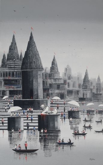 Latest creative work by Reba Mandal illustrates her ode to the beauty of Banaras Ghats, Nandi, Ganga Ghats and other spiritual environment in picturesque form. She has shown Ganga Ghats at Varanasi which are fully of pilgrims, temples and prayers. She has