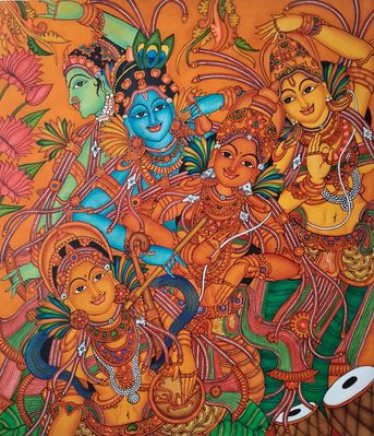 Lord Krishna dancing with five Gopikas. This is one of the finest examples of Kerala mural painting. The Kerala mural technique is an ancient Indian art form, traditionally found in temples and palaces.