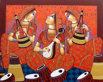 3This vibrant composition celebrates the Baul tradition of Bengal, portraying wandering musicians immersed in rhythm and devotion, where folk instruments and patterned forms echo the Baul philosophy of soulful restlessness and transcendent music.