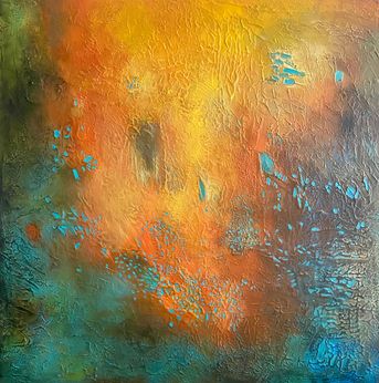 A vibrant textured abstract where orange, yellow, and teal converge in energetic layers, radiating warmth, contrast, and a sense of playful movement.
