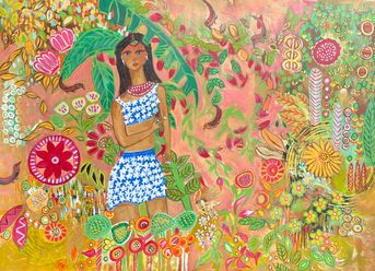 An original acrylic painting celebrating feminine strength and harmony with nature, featuring a poised woman in a white floral dress standing amidst a vibrant burst of stylised blooms that reflect her resilience and grace.