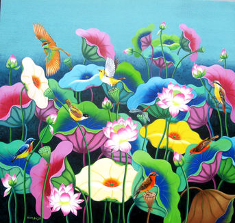 This is a colourful and detailed painting of multiple small, exotic birds flying and perching amongst an assortment of vivid lotus flowers and large leaves. The scene is set against a deep blue background, giving it a peaceful, fantastical feel.