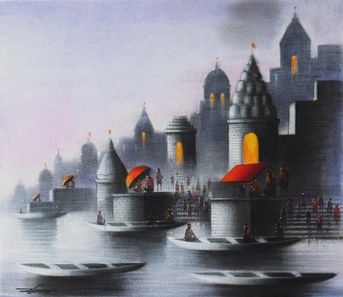 A serene riverfront scene where ancient temples, softly lit by dawn, reflect a quiet spiritual rhythm. The original painting beautifully captures the life, rituals, and timeless charm of an awakening city by the ghats.