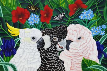 This vibrant artwork showcases three endangered bird species—the Sulphur-crested Cockatoo, Carnaby’s Black Cockatoo, and Salmon-crested Cockatoo—set amidst lush flora, celebrating the exquisite beauty and diversity of nature’s splendid creations.