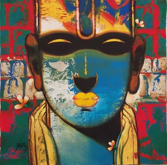 sienna, ochre and rust orange. The illustration of life with the abstract and bright colour scheme in this work brings out her storytelling and reflection of the mind.