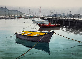 A peaceful harbor scene with anchored boats gently resting on calm waters. A soft, misty backdrop capturing the quiet charm of a coastal morning.