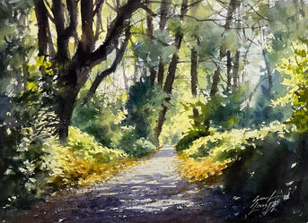 A tranquil forest pathway dappled in golden light, inviting a quiet walk into nature's embrace. A soft interplay of shadows and sunbeams capturing the beauty of a peaceful woodland trail.