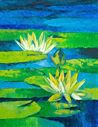 An original textured painting capturing the vibrant contrast of sun-kissed yellow water lilies against deep turquoise and emerald water.