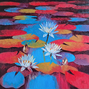 This vibrant contemporary painting depicts white water lilies floating in a pool of bright electric blue, surrounded by lily pads rendered in expressive, contrasting strokes of red, yellow, and deep maroon.