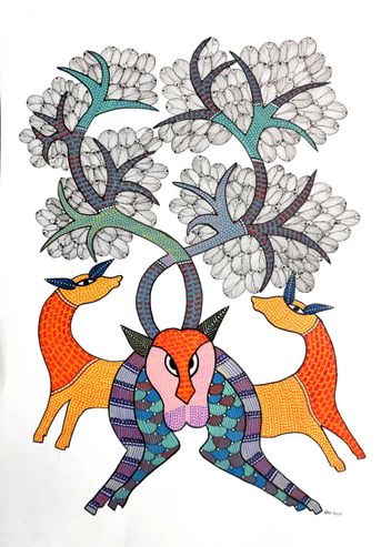 The word Gond comes from Kond, which means green mountains in the Dravidian idiom. Deeply connected with nature and natural elements, Gonds have traditionally drawn inspiration and represented their stories using strong natural elements. Trees, animals, birds, and other environmental representations are probably the most recognizable subject matter in their visual art practice. Gond paintings are known for their rich detail, bright colors, embedded mystery, and a taste of humor. However, these tribal artworks are anything but outdated. Not only do contemporary Gond artists use modern materials and methods but they also brilliantly represent contemporary scenes and concerns while keeping true to age-old traditions and style. This Orginal Painting is by Artist Ramesh Shaym.