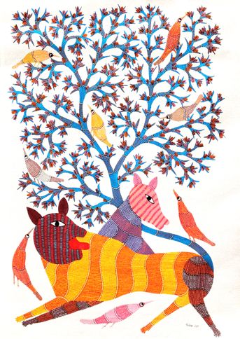 The word Gond comes from Kond, which means green mountains in the Dravidian idiom. Deeply connected with nature and natural elements, Gonds have traditionally drawn inspiration and represented their stories using strong natural elements. Trees, animals, birds, and other environmental representations are probably the most recognizable subject matter in their visual art practice. Gond paintings are known for their rich detail, bright colors, embedded mystery, and a taste of humor. However, these tribal artworks are anything but outdated. Not only do contemporary Gond artists use modern materials and methods but they also brilliantly represent contemporary scenes and concerns while keeping true to age-old traditions and style. This Orginal Painting is by Artist Lilesh Ureti.