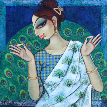 This captivating artwork portrays a woman as a personification of grace and poise. Draped in a serene white saree adorned with peacock motifs, she mirrors the elegance of the “Mayura” (peacock) feathers blooming behind her. Her elongated, lotus-shaped eyes enhance the sense of quiet beauty and refined expression.