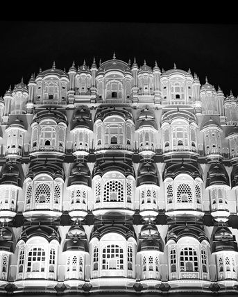 A timeless black-and-white photograph of Jaipur’s iconic Hawa Mahal, capturing its intricate latticework and perfectly symmetrical façade. The image highlights the Palace of Winds’ historic purpose—offering royal women a discreet view of the vibrant streets below.